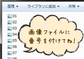 お作りいただいたフォルダの中に、使用したい画像をすべて入れてください。スマートフォンや携帯電話で撮ったお写真を含めたい場合は、各端末からパソコンにお写真を転送してフォルダの中に入れてください。 ※むかしの携帯電話で撮ったものやプリクラサイズの小さな画像などは、表示が粗くなりますことをご了承ください。 ※紙焼きのお写真を含めたい場合など、お写真を画像ファイルに変換できないお客様のために、画像ファイルオプション(税込¥2,000)をご用意しております。 |